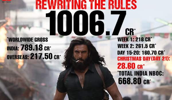 ஆதித்ய தார் இயக்கத்தில் ரன்வீர் சிங் நடிப்பில் கடந்த டிசம்பர் 5ம் தேதி திரைக்கு வந்த படம் துரந்தர். அவருடன் அக்சய் கண்ணா, சஞ்சய்தத், மாதவன், சாரா அர்ஜுன் உள்ளிட்ட பலர் முக்கிய வேடங்களில் நடித்துள்ளார்கள். 300 கோடி பட்ஜெட்டில் உருவான இந்த படம் இதுவரை 21 நாளில் ரூ.1006.7 கோடி வசூலித்திருக்கிறது. இதில் இந்தியாவில் மட்டும் 789.18 கோடியும், உலகளவில் 217.5 கோடியும் அடக்கம். இந்த துரந்தர் படத்தின் இரண்டாம் பாகம் 2026ம் ஆண்டு மார்ச் 19ம் தேதி ரிலீசாக இருப்பதாக அறிவிக்கப்பட்டுள்ளது.